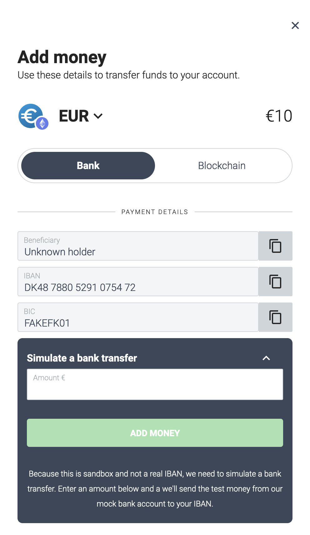 • Create a test IBAN transfer onto the account. The tokens from this test transfer will be available in the Safe.